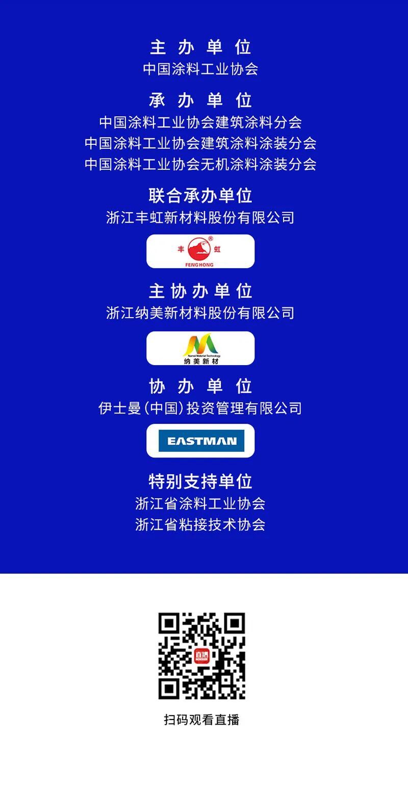 中国涂料工业协会会长刘普军,首都经济贸易大学教授、京津冀房地产研究院院长赵秀池,中国建筑涂料行业资深专家林宣益,中国涂料工业协会副会长刘东华、杨惠静,浙江丰虹新材料股份有限公司总裁王春伟,浙江纳美新材料股份有限公司总经理史炜,以及中国涂料工业协会建筑涂料分会、中国涂料工业协会无机涂料涂装分会和中国涂料工业协会建筑涂料涂装分会的领导嘉宾出席了本次大会,来自建筑涂料生产、原材料及涂装等上下游企业代表150余人与会。浙江丰虹新材料股份有限公司董事长施明奎、浙江纳美新材料股份有限公司董事长赵磊参加了同期活动。 本次会议由中国涂料工业协会主办,中国涂料工业协会建筑涂料分会、中国涂料工业协会建筑涂料涂装分会、中国涂料工业协会无机涂料涂装分会承办,浙江丰虹新材料股份有限公司联合承办,浙江纳美新材料股份有限公司主协办,伊士曼(中国)投资管理有限公司协办,同时得到浙江省涂料工业协会、浙江省粘接技术协会特别支持。大会先后由中国涂料工业协会建筑涂料分会秘书长张世元、中国涂料工业协会无机涂料涂装分会副秘书长许远东先后主持。